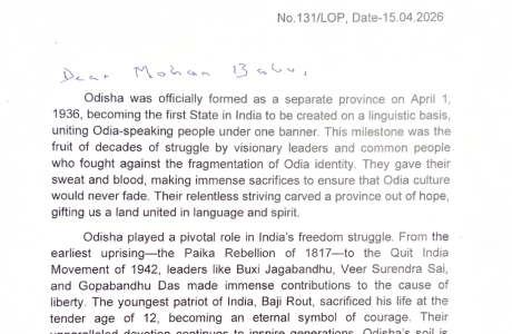 ସୀମା ପୁନଃ ନିର୍ଦ୍ଧାରଣ ପ୍ରସଙ୍ଗରେ ମୁଖ୍ୟମନ୍ତ୍ରୀ ଶ୍ରୀ ମୋହନ ଚରଣ ମାଝୀଙ୍କୁ ବିରୋଧୀ ଦଳ ନେତା ଶ୍ରୀ ନବୀନ ପଟ୍ଟନାୟକ ଆଜି ଏକ ଚିଠି ଲେଖି ଆଗାମୀContinue Reading……